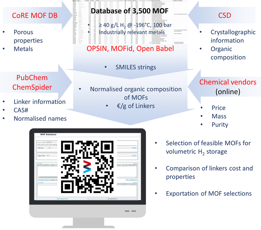 Physical adsorption at cryogenic temperature is a reversible mechanism that can reduce the pressure of conventional compressed gas storage systems. Metal–organic framework (MOF) materials are remarkable candidates due to the combination of high specific surface area and density which, in some cases, provide a high volumetric storage capacity. However, such extensive use of MOF’s for this application requires the selection of affordable structures, easy to produce and made from feasible metallic and organic components. Herein, we introduce a MOF database detailing the crystallographic and porous properties of 3 600 existing MOF’s made from industrially relevant metals and their organic composition. The comparison of the available minimum costs of linkers allowed the creation of a database to select affordable structures with high potential for volumetric hydrogen storage by cryoadsorption, considering their composition based on individual or mixed building blocks. A user interface, available online, facilitates the selection of MOFs based on the properties or names of structure and linkers.