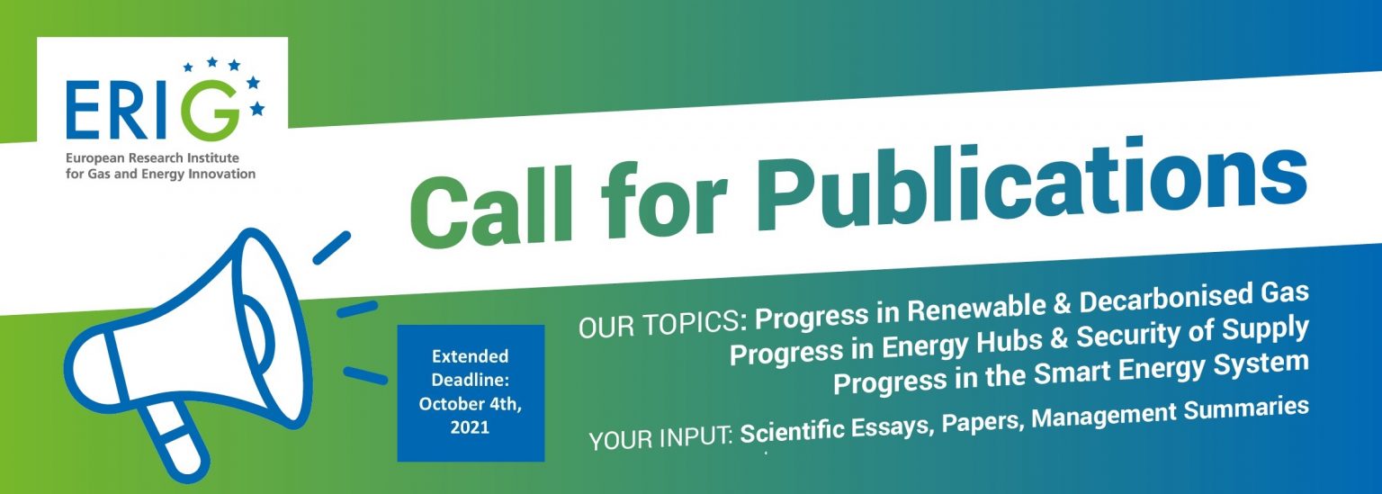 Building on the “ERIG Theses for the European energy future” we bid you the opportunity to publish results and summaries of your scientific work and activities in research and innovation addressed withing that context. Following the guiding principles and the three theses, ERIG forsees to publish the collected contributions in three dossiers: “Progress in Renewable & Decarbonised Gas”, “Progress in Energy Hubs and Security of Supply” as well as “Progress in Smart Energy System”. Your contributions can have the form papers, essays, management summaries, etc. and will be reviewed and compiled into free publications by ERIG. Please follow the detailed instructions and submit your contribution until October 4th, 2021.
