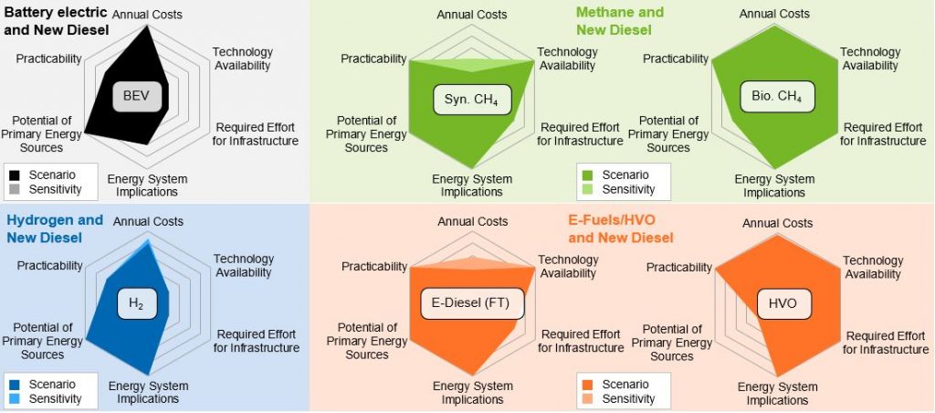 The results shows that while all options have their strengths and weaknesses, the biological based and synthetic renewable fuels that are combined with conventional internal combustion technologies makes an especially strong case in the short term until 2030, while still also offering a long-term perspective with the power-to-gas/fuel-technologies.