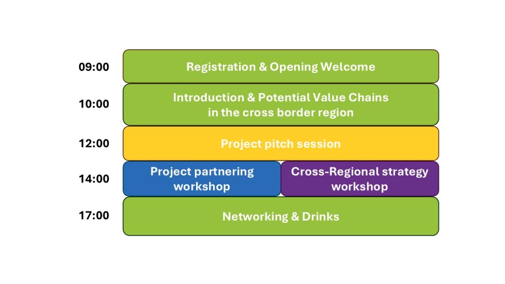 Following the introduction and the agenda item “Potential value chains in cross-border regions” and the project pitch sessions in the morning, the conference will split into two streams at 2 p.m.: the project partnering workshops (with participants from point 1) and the cross-regional strategy workshop (with participants from point 2).